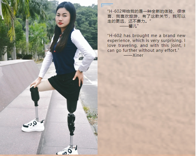 我们的目标是: 走向世界的民族品牌 Our goal is to: National Brands Going Global 馨儿体验后,激动的表示:比想象的还要好,特别舒服,很轻盈,迈步的时候不需要往前踢,它自动的会有往前的动作,还有屈膝保护,很安全! 穿戴假肢多年的她,此次佩戴新关节,适应能力很强,磨合的很快,以非常短的时间就可以独立行走。 “真好!我又可以多走几公里了!” 是对我们产品最大的褒奖,我们深感荣幸。 After experiencing it, Xiner excitedly expressed that it was even better than expected, especially comfortable, very light, and there was no need to kick forward when taking steps. It automatically moved forward and had knee protection, very safe! She, who has been wearing prosthetics for many years, has strong adaptability and can quickly break in with the new joint. She can walk independently in a very short time. "That's perfect! I can walk a few more kilometers now!" It is the greatest praise for our product, and we are deeply honored. 2. 模特体验秀 Model Experience Show 经历的是岁月和人生 重生的是盔甲和自我 如今 我能更自信的说 我比大多数人更了解生活 也没有什么比爱自己更重要 I have experienced time and life Reborn are armor and self Now I can confidently say I understand life better than most people Nothing is more important than loving myself